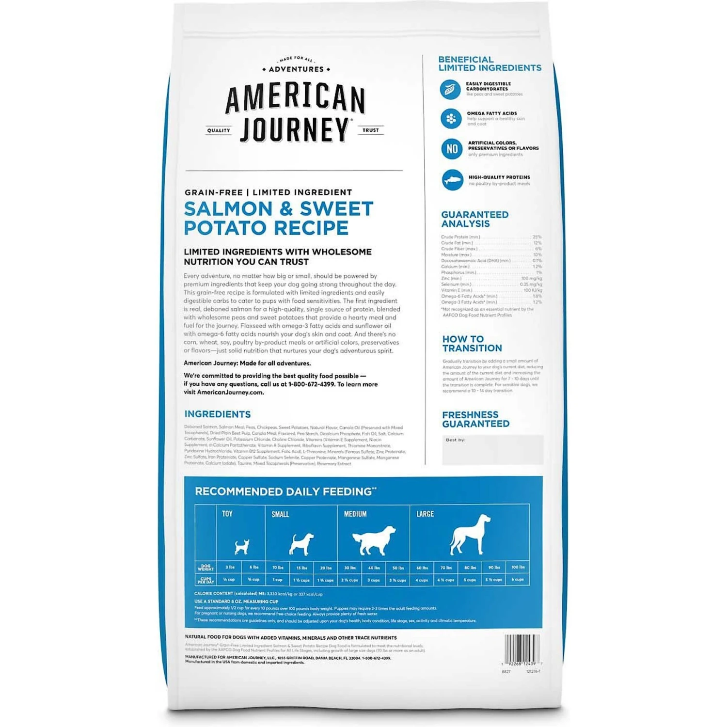- American Journey Limited Ingredient Salmon and Sweet Potato Recipe is made with salmon as a single animal protein source, to support the needs of dogs with food sensitivities.