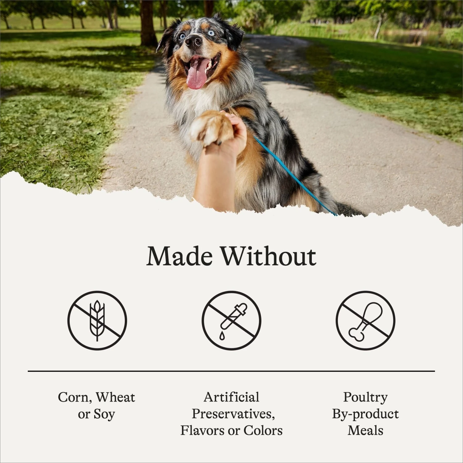 - No wheat, corn, soy, poultry by-product meals, artificial colors, artificial flavors or artificial preservatives.