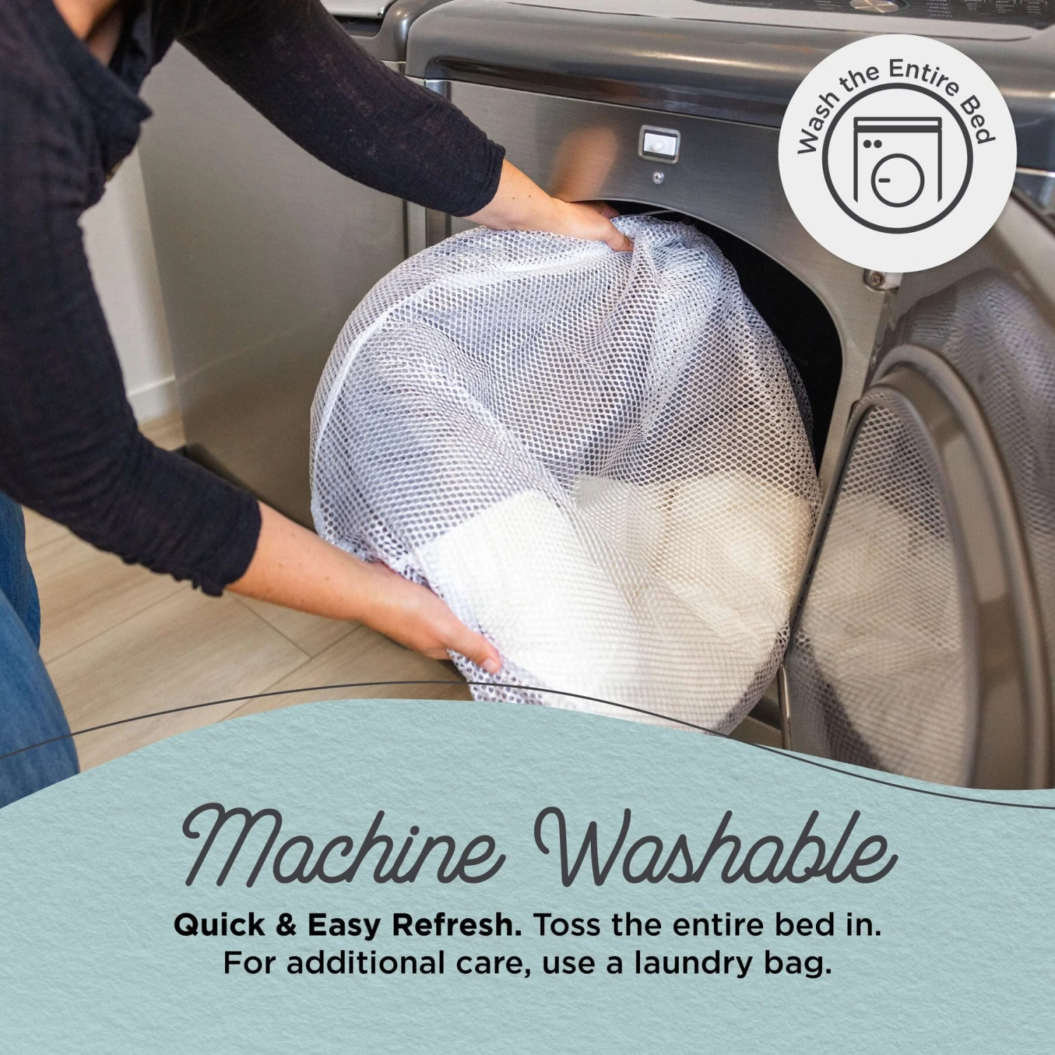 - Easily toss the bed in the washer and dryer when your pal has had one too many messy moments.