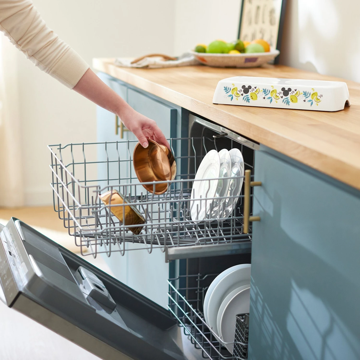 - This Disney Mickey Mouse melamine base comes in white with removable stainless-steel bowls, and is covered with Mickey’s face and a bunch of lemons for extra cuteness. Matching treat jar also available.