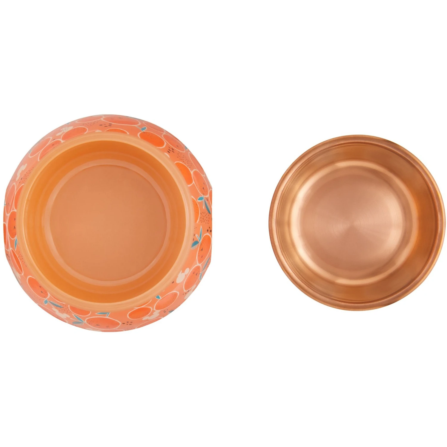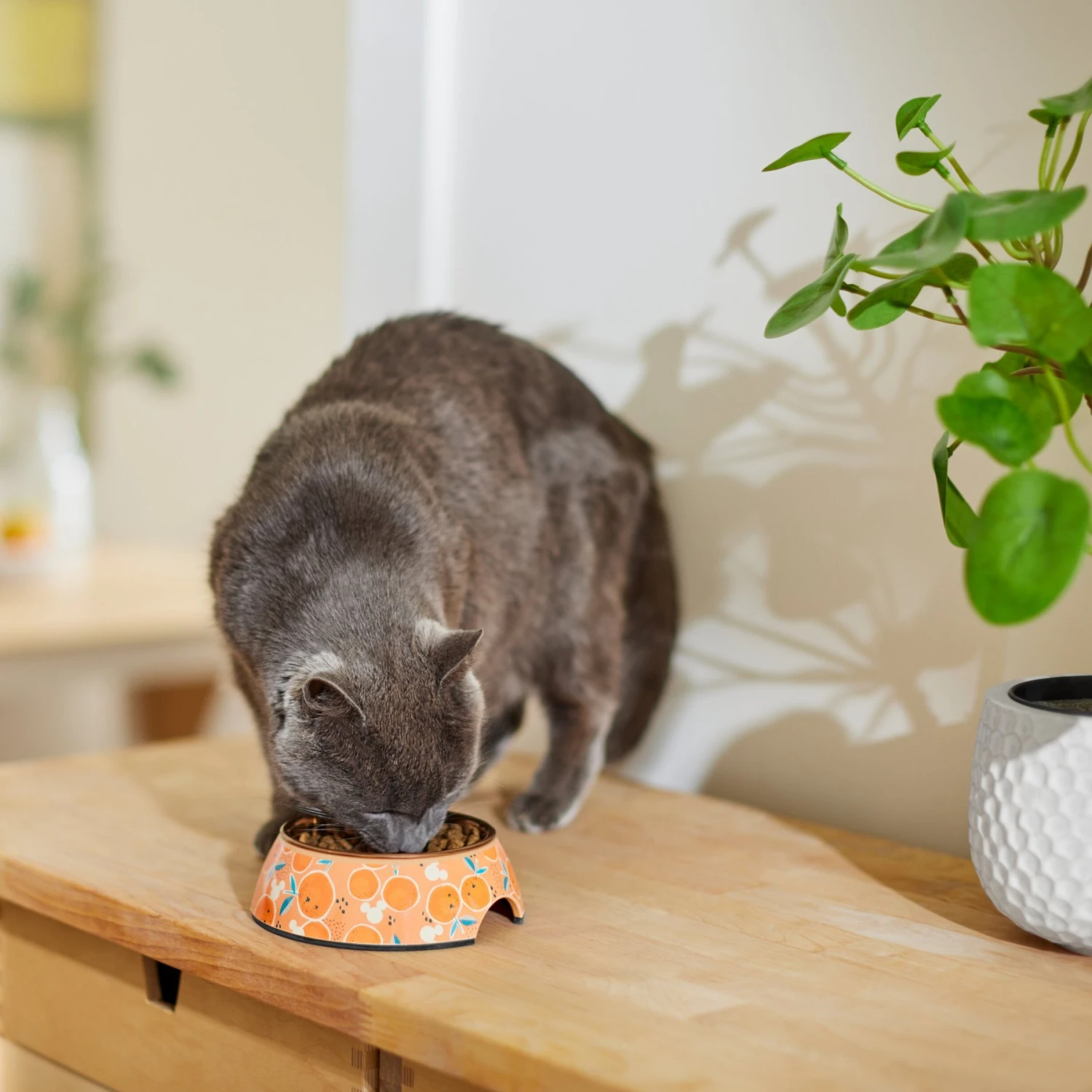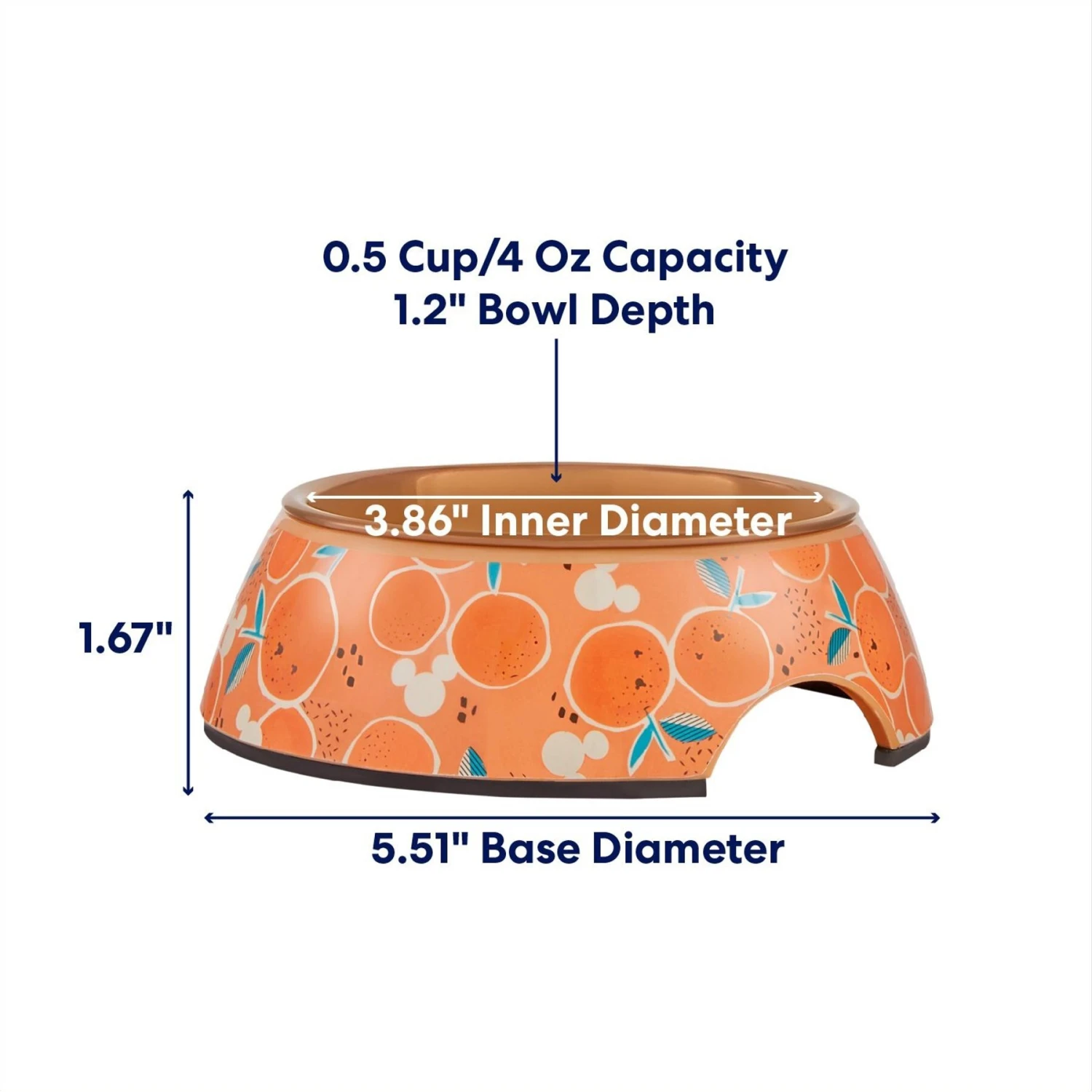 - This bamboo melamine base comes in orange with little white Mickey heads and oranges all over that will elevate your dog’s dining experience.