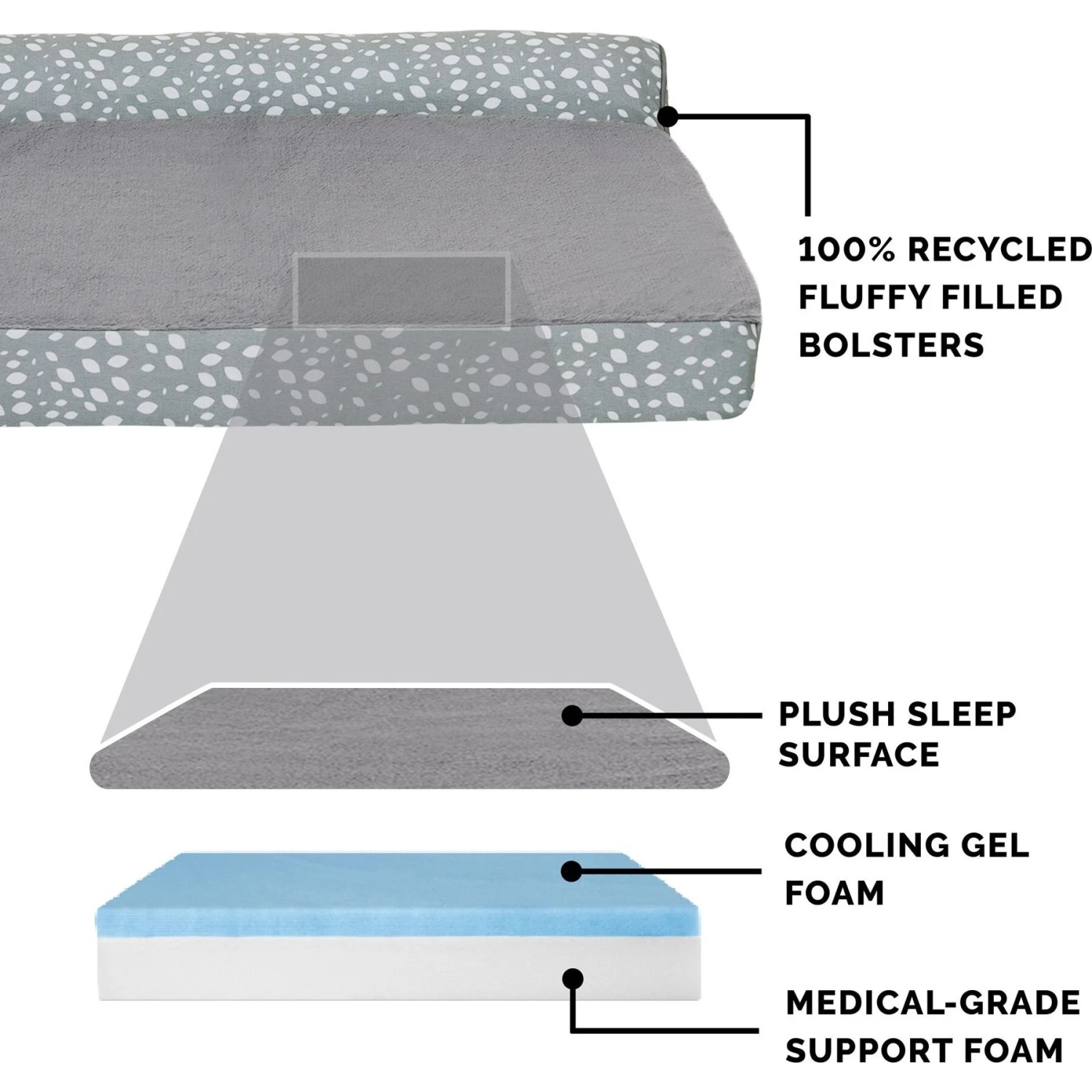 - Fluff-filled bolster railings support the neck, back, hips and joints to help ease discomfort and encourage restful sleep.