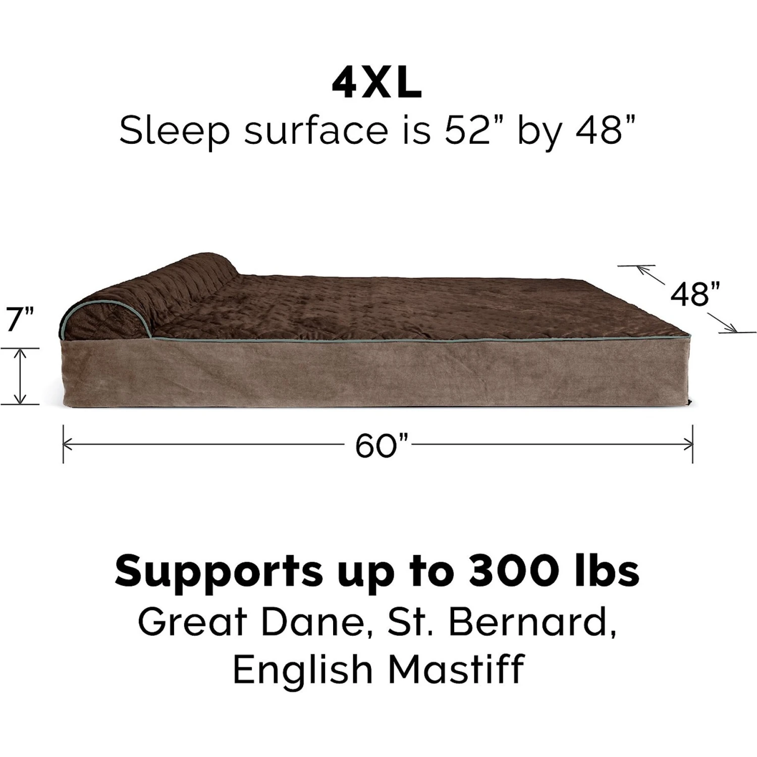 - Quilted dog bed is built with 7 inches of orthopedic foam for ultimate comfort—plus, it’s hefty enough to support dogs up to 300 pounds!