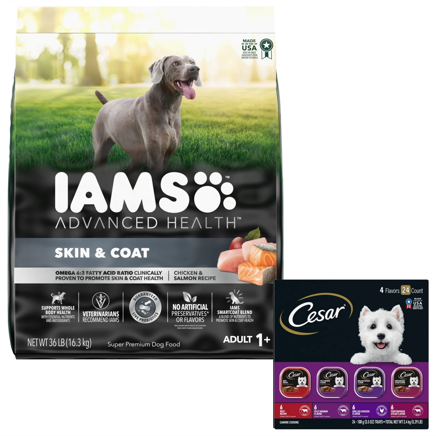 Iams Advanced Health Skin & Coat Chicken & Salmon Recipe Adult Dry Dog Food & Cesar Classic Loaf In Sauce Beef Recipe, Filet Mignon, Grilled Chicken & Porterhouse Steak Flavors Variety Pack Grain-Free Small Breed Adult Wet Dog Food Trays