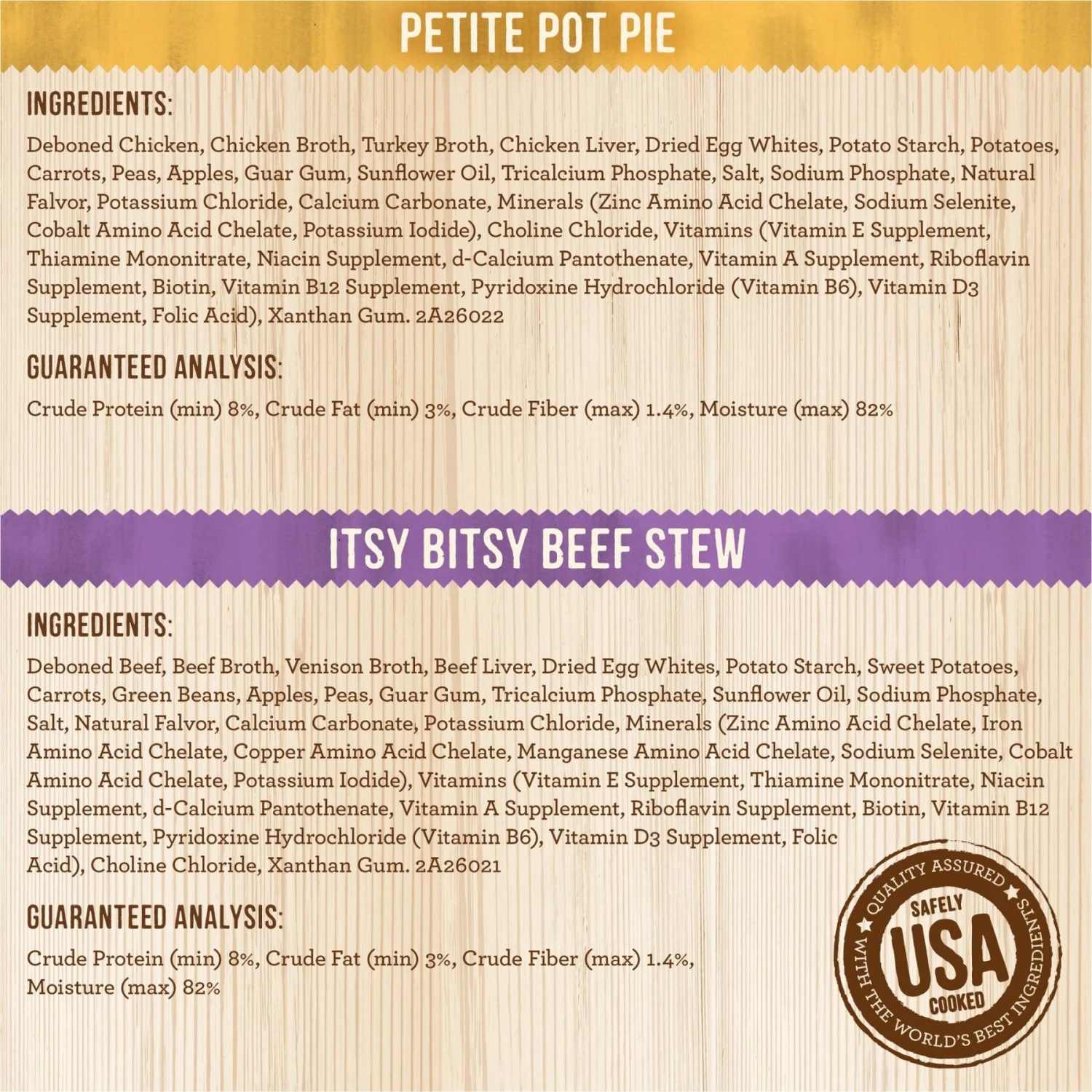 | Flavor | Dainty Duck Medley, Petite Pot Pie, Variety Pack: Beef Stew & Pot Pie, Surfin' & Turfin' Supper, Little Lamb Chop, Teeny Texas Steak Tips, Variety Pack: Steak & Thanksgiving, Tiny Thanksgiving Day Dinner, Itsy Bitsy Beef |