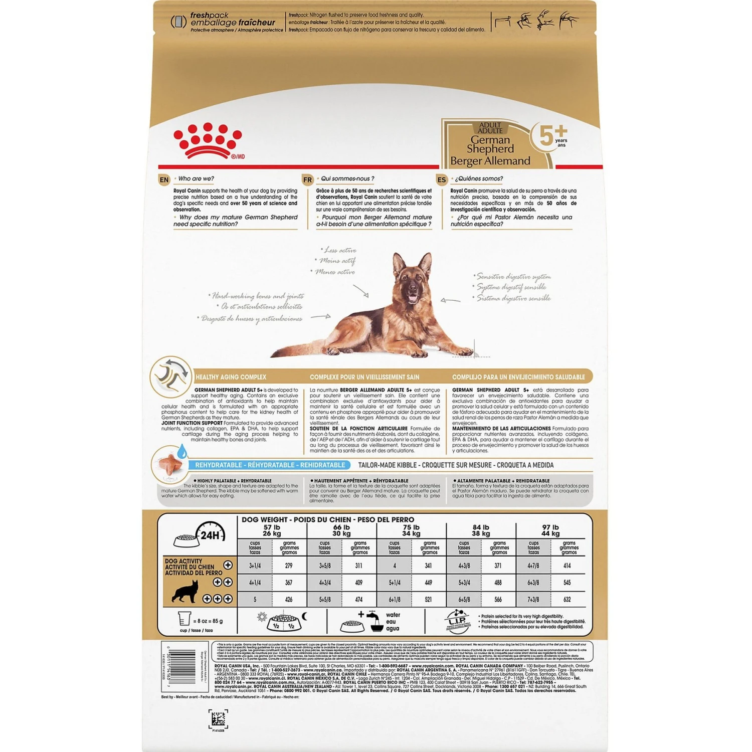 - Royal Canin German Shepherd Adult 5+ Dry Dog Food is complete and balanced nutrition designed to meet the specific needs of senior purebred German shepherds 5 years and older.
