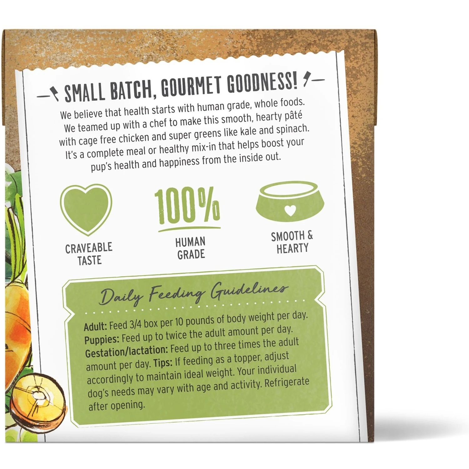 The Honest Kitchen Butcher Block Pate Chicken & Super Greens Pate Wet Dog Food, 10.5-oz, case of 6—The Honest Kitchen Butcher Block Pate Chicken & Super Greens Pate Wet Dog Food is a doggone easy way to keep your furry friend nourished! Made with cage-free chicken and farm-grown veggies such as carrots and green beans, this hearty wet food can help keep your canine companion happy and healthy. Mix it in with your pup’s regular breakfast, lunch or dinner, or serve it as a complete meal. With human-grade ingredients made in a human food facility, the quality of the ingredients holds up and offers a balanced diet for your precious pooch.