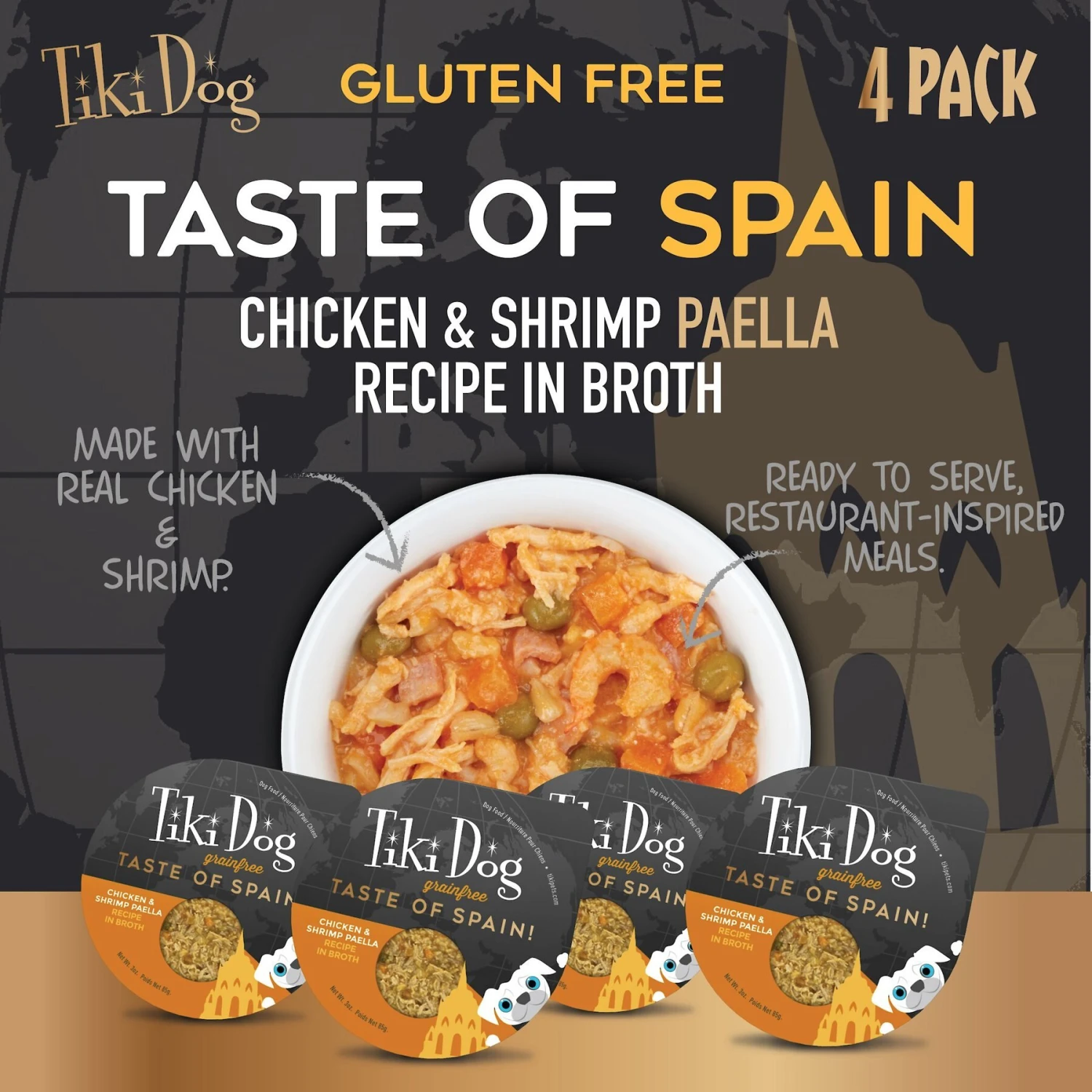 Tiki Dog Taste Of Spain Chicken & Shrimp Paella Recipe In Broth Gluten-Free Wet Dog Food, 3-oz Cup, Case Of 4