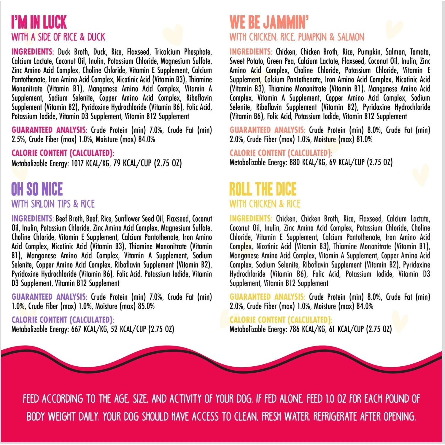 | Flavor | Picky Pooch Picnic Variety Pack, Wham Bam, Roll The Dice, Chicken Cup Hookup Variety Pack, Wanna Be Withya, We Be Jammin', You My Munchkin, Kiss Me Thrice, Fun Size Sampler Variety Pack, I'm In Luck |